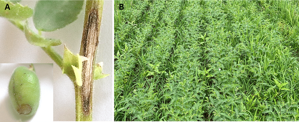 Figure 1 : Symptômes d'ascochytose sur tige et gousse de pois chiche (A). Forte pression adventice dans une culture de pois chiche (B). Photos : Margaux Guy.