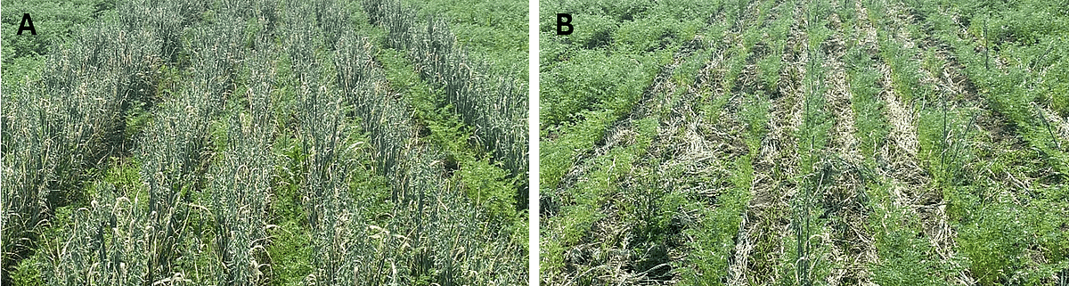 Figure 3 : Association pois chiche-avoine sans fauche (A) ou venant d'être fauchée au début de la floraison du pois chiche (B). Photos : Margaux Guy.