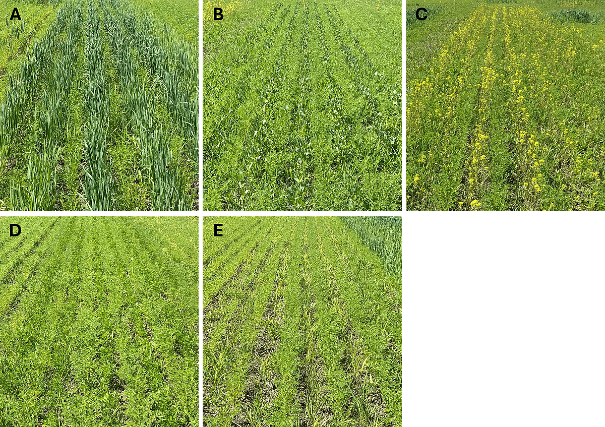 Figure 2 : Photographies des associations à base de pois chiche et d'avoine (A), de féverole (B), de moutarde blanche (C), de trèfle d'Alexandrie (D), et de Sorgho du Soudan (E), prises au stade 13 feuilles du pois chiche. Photos : Margaux Guy.